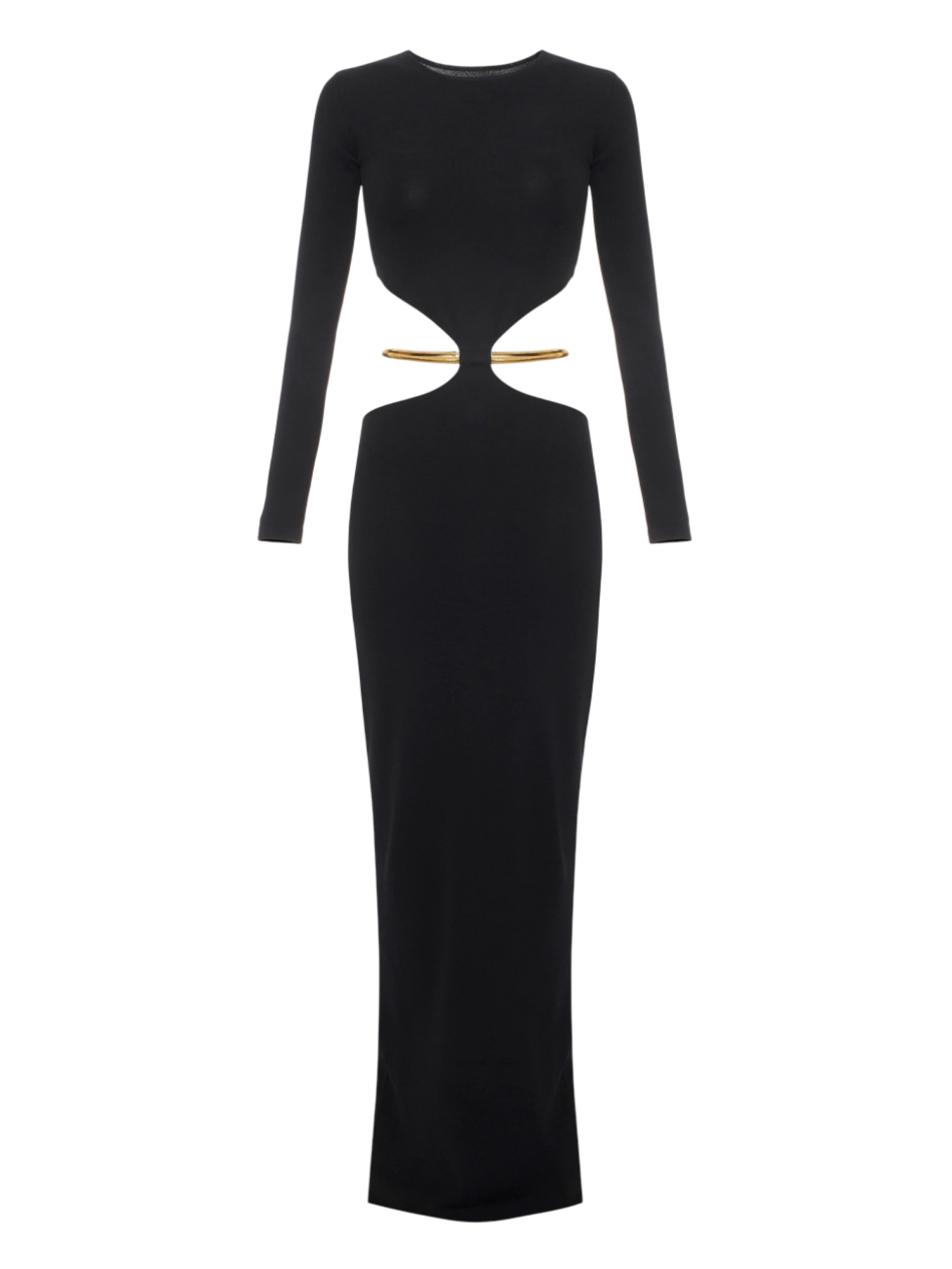 Caratterizzato da un elegante girocollo e maniche corte, il design di questo vestito è impreziosito da un'apertura cut out che aggiunge un tocco audace e contemporaneo. La cintina in galvanica dorata non solo accentua ulteriormente il punto vita, ma conferisce all'insieme un'aria di sofisticata opulenza.
