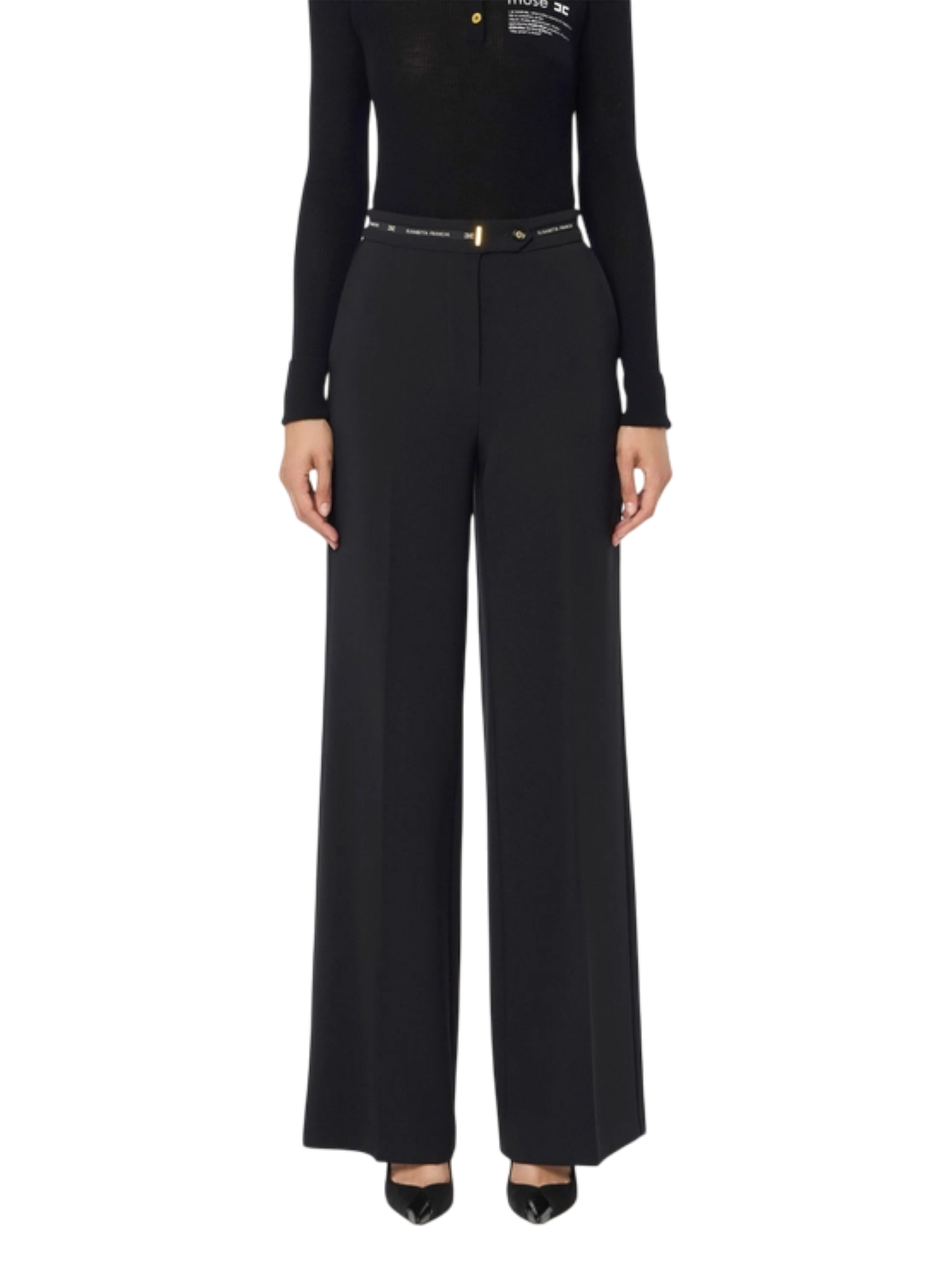 Scegliete i pantaloni palazzo in crepe nero di Elisabetta Franchi per un look sofisticato che non passerà inosservato.