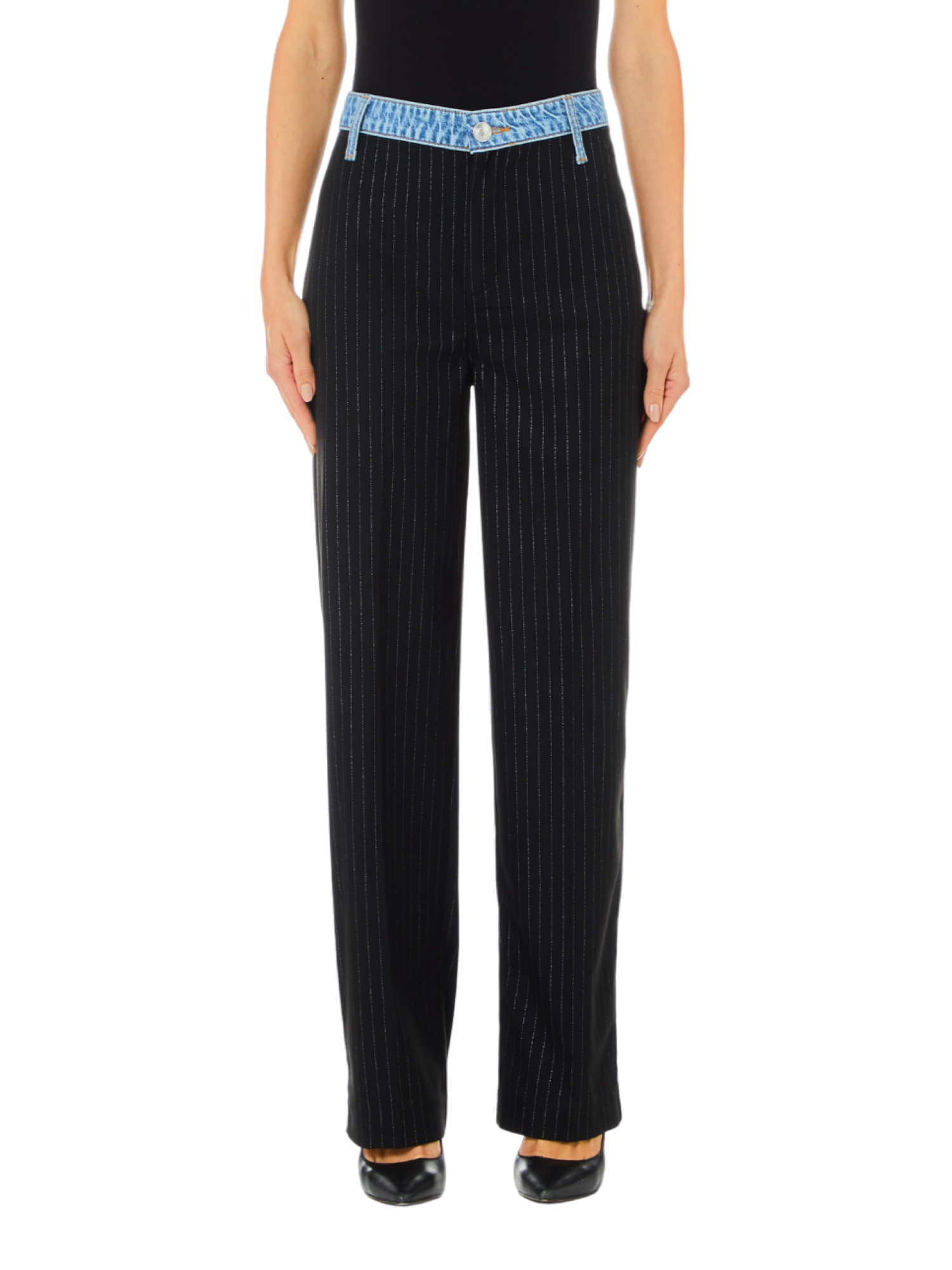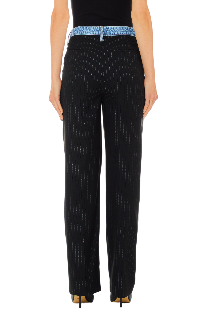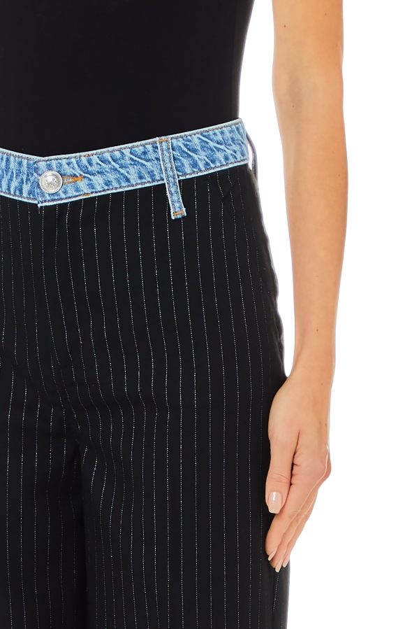 La particolare fantasia gessata, arricchita da interventi in lurex, conferisce un tocco di luminosità e stile, rendendo questo modello particolarmente versatile. La fascia in denim sulla vita assicura una vestibilità comoda, mentre la chiusura con bottone e cerniera nascosta garantisce un aspetto impeccabile e minimale.