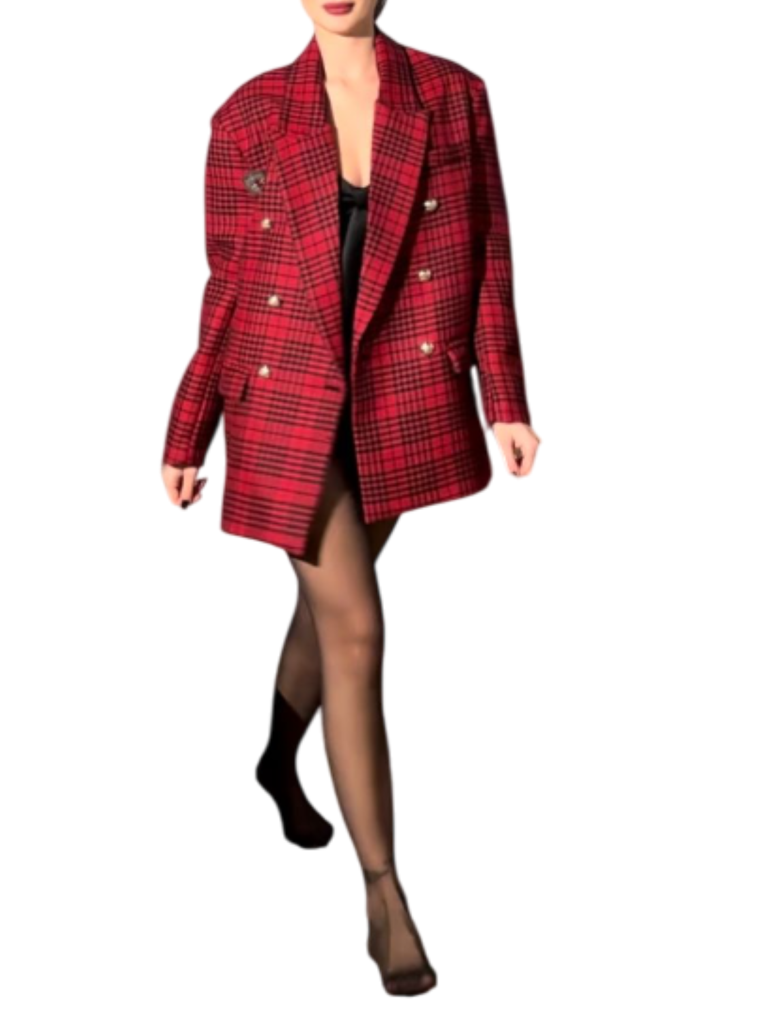 Realizzata con una pregiata attenzione ai dettagli, questa giacca presenta un design doppiopetto che esalta la silhouette femminile, donando un tocco di classe a qualsiasi outfit. La fantasia scozzese rosso aggiunge un elemento di vivacità e carattere, rendendo ogni look unico e originale.