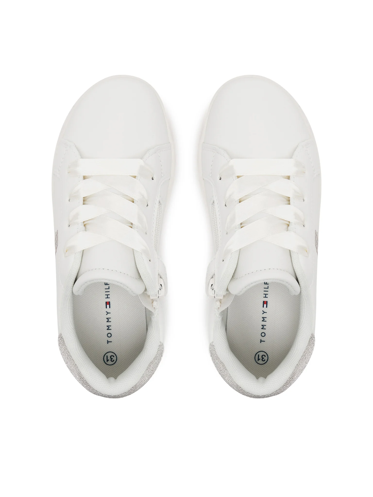 Scopri le sneakers da bambina di Tommy Hilfiger, realizzate in ecopelle di alta qualità e arricchite da eleganti dettagli glitter bianchi. Queste sneakers uniscono comfort e stile in un design unico, perfetto per le piccole fashioniste che vogliono distinguersi.